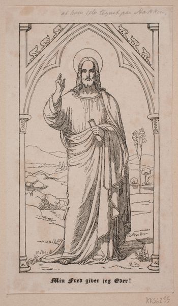 Curator: This woodcut, titled "Kristus velsignende", which translates to "Christ Blessing," was created around 1840 by Axel Theodor Kittendorff. It's currently held at the SMK, the National Gallery of Denmark. Editor: It's quite striking. There's a calmness to it, almost ethereal. The monochromatic lines are crisp, yet there's a softness in the rendering of Christ’s features and garments. Curator: Kittendorff worked within a period that saw religious art being both critiqued and revitalized. Prints and drawings like these circulated widely, influencing popular conceptions and devotion. They became important, public markers. Editor: The blessing gesture is clearly a potent symbol— a universal sign of benediction. And he carries what seems to be a scroll, implying scripture, tradition and divine knowledge. It reminds one of the endless iconography surrounding this imagery. The arch too suggests institutional authority and timelessness. Curator: Yes, and I think it's important to also look at who consumes these types of images, and their social environments at the time. This could represent the period's cultural movement for spiritual revival amongst common people, that used art to give shape to complex political feelings. Editor: Precisely. Even the backdrop lends itself to the narrative— a tranquil landscape symbolizing hope and promised lands. There’s an implicit invitation into an eternal narrative, it presents Christ as not just a historical figure, but a perennial presence. Curator: It is interesting that the figure of Christ stands in the foreground with this generic looking scenery in the background, which invites further consideration as to how audiences from various societal status positions, or geographical backgrounds receive or identify with it. Editor: Absolutely, art becomes an access point, to spiritual narratives, personal reflections, or the visual memory that comes before our own time. Curator: Examining art through this lens allows us to gain more insights of the values, ideas, or biases prevalent during Kittendorff’s time. Editor: It serves to understand how those sentiments have either evolved or remained deeply embedded within our collective consciousness through iconic symbolism. Thank you.