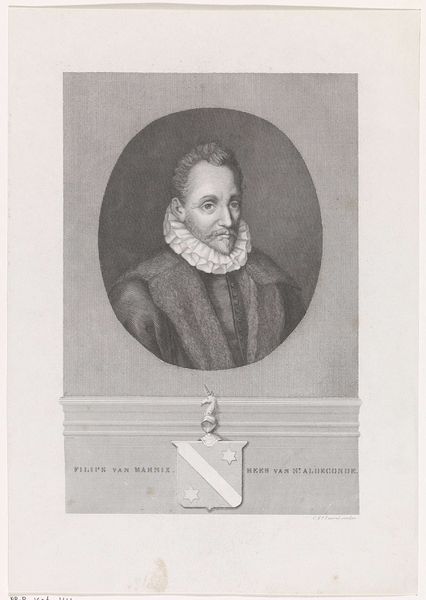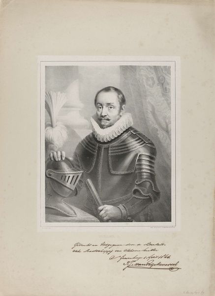 Edouard Taurel created this portrait of Maximiliaan de Hennin, graaf van Bossu, using a technique called line engraving. This meticulous process involves incising lines into a metal plate, which then holds ink to transfer the image onto paper. What's fascinating here is how the material reality of engraving profoundly shapes the portrait. The precise, controlled lines lend a formality and seriousness to the subject, befitting his noble status. Look closely, and you'll see how the density and direction of the lines create tonal variations, defining the contours of his face and the texture of his armor. Engraving has deep roots in printmaking, traditionally used for reproducing images and texts, connecting it to broader social dynamics of communication and knowledge dissemination. The sheer labor involved in creating such a detailed image speaks to the value placed on representation and commemoration during this era. Considering the materials and making process allows us to see how the artist skillfully used the medium to convey not just a likeness, but also ideas about power, status, and the enduring nature of an engraved image.