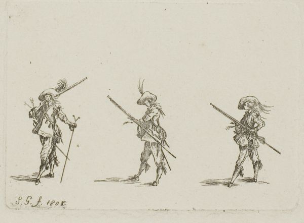 Johann Ludwig Ernst Morgenstern made this graphite drawing titled "14 Figurenstudien, meist Soldaten" sometime between 1738 and 1819. During this time, military personnel occupied a vital role in society, with their presence and actions significantly influencing the balance of power and social order. In this study, Morgenstern skillfully depicts different groups of people with a focus on soldiers in various poses and interactions. Are they engaged in training exercises or perhaps embroiled in the tense moments before battle? What do the social interactions and body language suggest about the realities of military life during this era? The artwork prompts us to consider how societies are shaped by displays of strength and by those who wield such power. These character studies act as a mirror to the past, reflecting the complex interplay between the military, the state, and the individual.