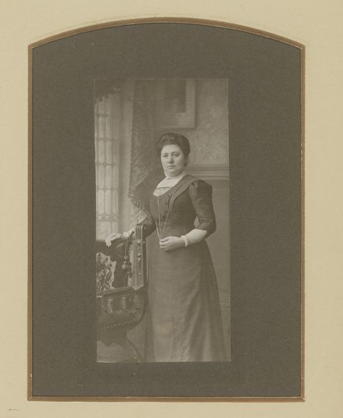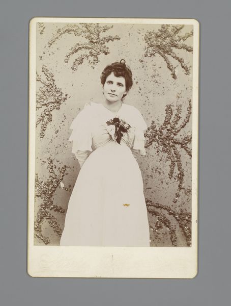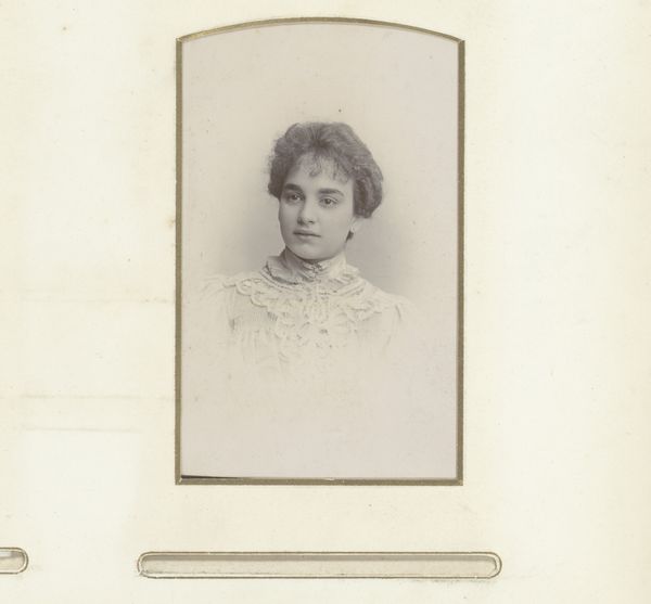 Editor: So, this albumen print portrait, titled "Portret van een onbekende jonge vrouw", dates to between 1900 and 1914. I’m struck by its formality, yet also the slight blurring, hinting at movement and disrupting that strict pose. What do you see in it? Curator: I am drawn to consider the labour embedded within this object. The albumen print, a popular photographic process during this era, reveals so much. Think about the process of making this object. From preparing the glass plate negatives, mixing and coating them with albumen—derived from egg whites—then exposing and developing each print. It was intensive labour. Editor: Egg whites, really? That is fascinating, I did not know that. How would you then relate such means of production to consumption at that time? Curator: Well, portrait studios like veuve Soyer democratized image production. The rise of the middle class created a demand for affordable portraiture, impacting the labour of photography. Albumen prints were mass-produced to feed into that consumerism. Note that the backdrop appears to be dark. I am curious about the staging and props used to construct this idealized vision of young womanhood, particularly how she is adorned and costumed. Can we understand these decisions about attire within its consumerist drive? Editor: Interesting point about consumption and image making, especially how studio portraits can tell us about societal aspirations. This print certainly expands what it means to see an ‘image’. Curator: Indeed. By examining the materials and mode of its production we better appreciate its impact and purpose in this moment of consumerism.