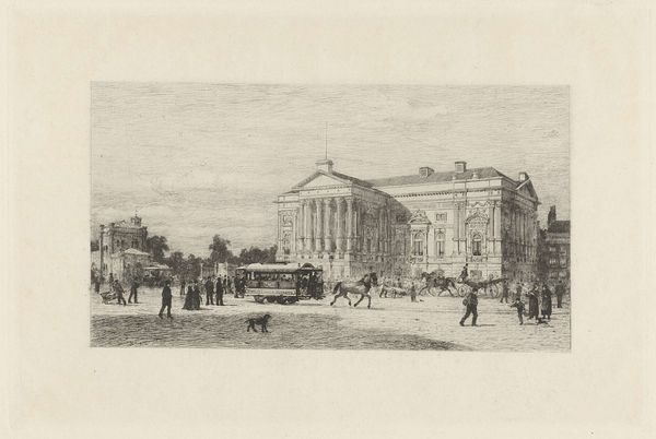 Curator: Childe Hassam’s etching, "The White House," presents a fascinating depiction of American political power. Editor: It’s striking how immediate it feels. The sketched lines give it an ephemeral, almost vulnerable quality, despite the gravitas of the subject. Curator: Hassam, known for his Impressionistic style, often imbued his cityscapes with subtle symbolism; here, the White House is framed by foliage, perhaps suggesting the relationship between governance and the land. Editor: And etched lines, you know, they’re so economical, direct. It really underscores the human hand in representing, even constructing, this national icon. The labor is right there. Curator: Absolutely. Consider also the emotional weight carried by this building; it represents both stability and the potential for change. Editor: Yes, it's interesting to think about how the choice of etching elevates a quotidian political setting into something quite profound. Curator: Indeed, it's a potent reminder of the complex layers embedded within seemingly simple representations. Editor: Agreed, Hassam prompts us to consider the material process and symbolism in shaping our perceptions of power.