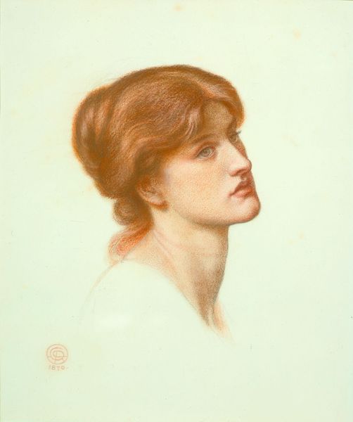 Curator: There's a quiet melancholy to this study, almost reverent. Editor: This is Dante Gabriel Rossetti's "Study for 'Dante's Dream': Head of Marie Spartali (Mrs. William J. Stillman)." The sitter, Marie Spartali Stillman, was a Pre-Raphaelite artist in her own right. Curator: The downward gaze, the soft coloring...it evokes a sense of sorrow, or perhaps deep contemplation. It resonates with Victorian ideas about femininity and interiority. Editor: Indeed. Rossetti often idealized his female subjects, and the symbolism surrounding them was very deliberate. Her face, with those distinct features, would have been interpreted through a complex lens of beauty standards and classical allusion. Curator: Knowing she was an artist herself, does it complicate the power dynamic here? Rossetti capturing her likeness...was she also capturing his? Editor: An interesting question. Rossetti shaped the aesthetic, but perhaps she subtly influenced his vision. Food for thought. Curator: Absolutely. It's a valuable reminder to consider not just the artist's intention, but the subject's agency, especially within a historical context so fraught with gendered expectations. Editor: Precisely, and how those expectations are still being dismantled.