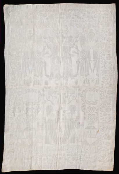 Curator: What an elegant textile! It feels very...ethereal. Editor: Indeed. Here at the Rijksmuseum, we have an interesting example of Baroque weaving from 1702. It is titled "Servet met Filips V, pretendent voor de Spaanse troon," which translates to "Napkin with Philip V, pretender to the Spanish throne." Curator: Ah, I see him represented along the bottom edge, astride a horse. Even in a monochromatic weaving, you get a sense of self-assuredness and the authority he projects. The entire cloth seems to radiate power. What a statement piece. Editor: The choice to depict this on a linen damask table napkin certainly makes a political statement! During the War of the Spanish Succession, imagery became a vital tool. Table linens like these weren't just for show—they were conversation starters, subtly (or not so subtly) influencing public sentiment. Curator: Absolutely. The symbolism is potent. The heraldic crests, repeated figures, and Latin phrases… it speaks to an era of royal propaganda conveyed through the everyday object. Did such symbols reflect a conscious effort to shape views toward him? Editor: Undeniably. Woven into the fabric of daily life, these napkins broadcasted support for Philip's claim. They are artifacts that remind us how art and design are always connected to politics. Consider how its intricate detail almost feels delicate—which contradicts the very intention, to inspire support during a time of war. Curator: And there’s something profoundly affecting about witnessing history pressed into fabric. These images persist in the memory. As durable artifacts, we might consider such cultural objects to shape history for many future generations. The level of detail… such patient craft... It echoes the idea of carefully laying the foundation of a dynasty. Editor: A fitting conclusion. What we observe is how even the simplest artifact of daily life communicates ambition, shapes understanding, and carries memory—connecting art and politics.