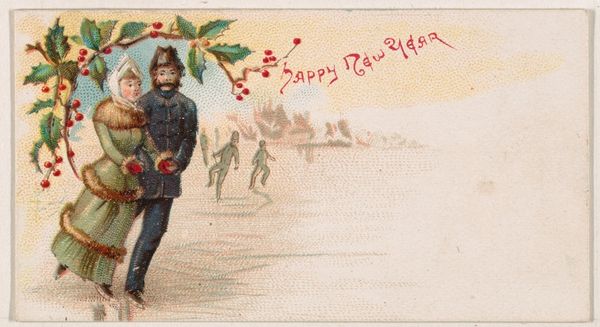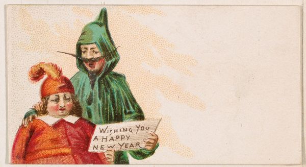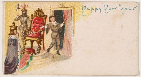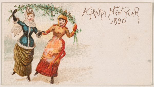 This small chromolithograph, "Happy New Year 1890", was part of a series of New Year cards produced by Kinney Bros. Tobacco Company. The image presents a symbolic transition: a boy representing the departing year 1889 is shown falling into "Oblivion," while a foot labeled 1890 steps confidently through a brightly lit doorway. These cards, distributed with tobacco products, were a form of advertising that also tapped into the late 19th-century culture of sending holiday greetings. The Kinney Brothers were pioneers in color lithography techniques at a time when mass media was expanding. Their strategic partnerships with artists and investment in technology allowed them to make inroads in advertising and popular culture. To fully appreciate the art's context, research into the history of advertising, print culture, and the tobacco industry would be invaluable. The meaning of art is dependent on social and institutional context.