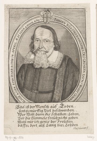 Editor: Here we have Hieronymus van Hensbergen’s “Portret van Franz Simon,” an engraving likely made between 1660 and 1690. There's a formality to it – a very serious-looking gentleman in a ruff, encircled by dense text. How do you interpret this work, considering its historical context and the subject's identity? Curator: This engraving is a fascinating artifact of its time. Beyond just depicting Franz Simon, it speaks volumes about social hierarchies and the role of religious figures. The density of text, for instance, isn't merely descriptive; it's performative, meant to legitimize and solidify Simon's status within his community. Consider the power dynamics at play: Who commissioned this portrait, and for what purpose? Was it intended for public display or private contemplation? Editor: That's interesting. I hadn't considered the text as actively "doing" something. I assumed it was just descriptive. So, are you saying that portraits like these played a role in reinforcing social order? Curator: Precisely. Portraits of prominent figures like Franz Simon, a pastor in Hamburg, served as visual affirmations of their authority and moral standing. The precise details—the ruff, the somber expression—contribute to this construction of power. Think about how such images would have been consumed and understood within the context of 17th-century European society, shaped by religious reformations and burgeoning print culture. Editor: It makes me think about the use of portraits today. Are we still doing the same thing – creating visual symbols of power and status? Curator: That's a great question. While the overt symbolism may have shifted, the underlying dynamics of representation remain remarkably persistent. Consider how politicians or celebrities are presented in carefully curated images, designed to project a particular image and influence public perception. The technology has changed, but the goal of constructing and controlling narratives through visual media remains a powerful force. Editor: Thanks, I am not only considering the artistic aspects, but also the purpose of such artwork for that era, and reflecting on the contemporary parallels to those images. Curator: Absolutely. Understanding the social and historical context allows us to see this engraving not just as a representation of an individual but as a lens through which we can examine broader questions of identity, power, and representation across time.