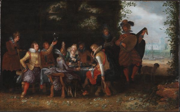 Curator: Standing before us is Wolfgang Heimbach’s "Evening Interior," painted in 1651. It’s rendered with oil paint on panel and exemplifies Dutch Golden Age painting. Editor: My initial impression is of shadowy intrigue, like peering into a clandestine gathering. The artist uses dramatic chiaroscuro; some figures are lit so brightly, while others fade into the gloom. Curator: Absolutely. Heimbach masterfully deploys chiaroscuro, pulling focus onto distinct groupings. Structurally, we can observe the composition unfolding in layered planes, from the card players to a secondary space with what seems to be a crowd of people illuminated further in the back. Editor: Right, this secondary scene feels less like an extension of the same room and more like a glimpse into a parallel world. Perhaps reflecting social structures, where power and secrecy dwell just behind the scenes. Genre paintings, such as this, offered viewers narrative insight into a social history, revealing a scene from domestic, and in this case potentially controversial, affairs. Curator: From a formalist viewpoint, note how light almost sculpts the subjects, highlighting the textural details of their garments and faces. Heimbach uses the materiality of light itself to signify importance. The intense contrast, for example, around the central man reading signifies some authority, separating him visually from the gamblers on the left. Editor: And that authority perhaps reflects the moral anxieties around gambling prevalent during this period. The artist doesn’t seem to overtly condemn or condone; instead, Heimbach’s painting encourages consideration about the ethics involved. These interior scenes offered commentary on societal behaviors during the era. Curator: A key technique here is the arrangement of bodies; it controls the overall viewing experience, drawing the viewer deeper into the subject matter with light and shadow acting as a kind of symbolic syntax. We are drawn toward the source of reading with curiosity and perhaps cautious skepticism. Editor: Indeed, art offered some social critique within the comfortable realm of genre-painting, allowing discourse on cultural tendencies while giving an open ending on how things “should be.” Heimbach prompts discourse through carefully rendered light and form, inviting debate about what goes on behind closed doors. Curator: It’s interesting how Heimbach guides us as viewers through compositional decisions and through a sophisticated visual narrative, urging us to draw connections within the picture itself. Editor: And in doing so, provides the museum space to act as a modern site for continuation of similar conversations.