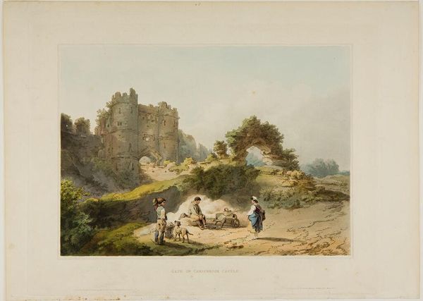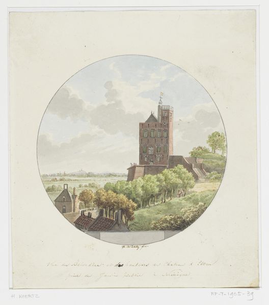 Editor: Here we have "View of the Belvédère in Nijmegen" from sometime between 1809 and 1845 by Johannes Franciscus Christ, a print. It feels so calm and orderly, almost like a stage set, doesn't it? What strikes you when you look at it? Curator: It's like stepping back in time, isn't it? That tower dominating the skyline, the groups of people strolling leisurely... it evokes a real sense of nostalgia. What I find interesting is the way Christ balances the man-made – the Belvédère itself – with the natural world. The Belvédère is juxtaposed against that expressive sky, creating a dramatic, yet peaceful, tension. Does the positioning of the figures within the image spark anything for you? Editor: They definitely add a human scale, like we're invited to step into this memory of Nijmegen. They seem posed, somehow... What did it mean to paint "en plein air" back then, compared to today? Curator: It was quite radical! Working directly in nature, trying to capture the fleeting effects of light and atmosphere... this was fairly new for the time. The commitment to accurately portray the natural world – although through the lens of Romanticism – it must have felt like a revelation. It’s a step away from formal studio landscapes, toward a more direct and subjective engagement. I see so much fresh perspective and emotion, don't you think? Editor: Absolutely! It's almost like a postcard from another century, colored with feeling. I hadn’t thought about the “en plein air” aspect—it’s fascinating to picture him there, capturing that particular light. Curator: Exactly. We see history, sure, but we also sense a kindred spirit, an artist striving to capture a fleeting moment in a world undergoing profound change, same as us. What could be more current than that?