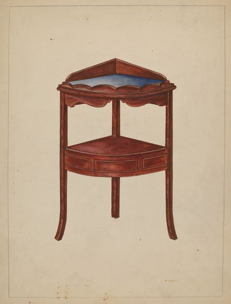 Curator: Here we have Harry Eisman's "Card Table," circa 1937, rendered in colored pencil. Editor: I'm immediately struck by its simplicity. There's a quiet elegance in the form, a visual paring down to essentials. The semi-circular shape creates a pleasing, almost classical balance, don't you think? Curator: Certainly. And given that it was created in the late 1930s, it is interesting to consider the context, a period defined by both economic depression and burgeoning international tension. These tensions existed alongside a culture of card playing and games as ways to create community. Editor: I notice the meticulous detailing on the table's surface and the legs. The artist seems to have focused on capturing the qualities of light playing across the wood grain. Note how the shading defines the form. What I see here is more than a table. The form takes on an almost sculptural presence. Curator: The card table occupies a specific position in social history. Games, particularly cards, were associated with domestic leisure and social gatherings. One has to ask what sort of gatherings this particular card table would host. Were they innocent or illicit? Friendly or adversarial? Who was included in the space of the game, and who was excluded? Editor: You raise interesting questions about the narrative. I am compelled by the cool restraint and clarity with which the artist constructed this image, focusing our eye on the subtle interplay of line and texture to communicate its physical form. The rendering suggests functionality and refined taste of this simple furnishing. Curator: By understanding the social context surrounding its creation, we can go beyond the artwork's physical components. Its existence touches on themes of economic hardship, gendered social spheres, class dynamics, leisure time, and, above all, the sense of collective escapism so prevalent during this period. Editor: Considering those external factors offers insights beyond the compositional elements. Thanks to our conversation, I am able to enrich my understanding of this very evocative study of interiority. Curator: Precisely. Together, these approaches enrich our comprehension, illustrating how context and composition combine to tell layered, complex narratives.