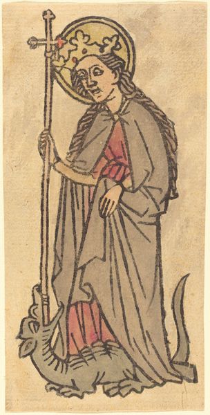 Editor: This is “Heilige Agnes,” or “Saint Agnes,” a tempera, ink, and drawing piece created sometime between 1463 and 1500 by Meester van de Olijfberg uit de Verzameling Dutuit, which I think translates to Master of the Mount of Olives from the Dutuit Collection. There’s something really charming about its simplicity and the directness of the line work. How would you interpret this work from a historical perspective? Curator: Considering its creation period, the late Medieval era, this work embodies a crucial function of art: religious instruction and reinforcement of cultural values. The stylized lines and relatively simple composition are typical of the period's approach to making religious figures legible to a largely illiterate population. We need to see it within its socio-political environment. Editor: Could you expand on the idea of cultural values conveyed through imagery? Curator: Absolutely. Notice the lamb, Agnes’ attribute symbolizing her purity and sacrifice. The crown suggests her martyrdom and saintly status, important attributes that are emphasized to promote emulation by the contemporary population. Consider the act of seeing itself; religious art provided visual models for behavior and belief in a society steeped in faith. What do you think about its purpose beyond a visual representation? Editor: So, it's less about artistic expression and more about its function within a belief system and community. I hadn't considered the active role it played in shaping viewers’ perspectives! Curator: Exactly. The work is shaped by the institution of the church and religious belief, acting almost as a tool within these contexts. It encourages us to look beyond mere aesthetics and understand how artworks historically shaped societal norms and perspectives. Editor: I’ll never look at religious art the same way. It makes you wonder about art’s public role then, compared to how we view it now. Thanks for the insight!