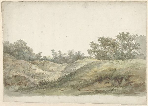 Editor: Here we have Jonathan Skelton's "Part of Blackheath," undated, a watercolor piece held at the Tate. The muted palette and serene composition give it a tranquil, almost melancholic feel. What does it evoke for you? Curator: This work speaks volumes about the relationship between humans and the land. Blackheath, then as now, occupied a contested space between rural idyll and encroaching urban development. Skelton, consciously or not, reflects this tension. Editor: How so? Curator: Consider the lone tree, imposing yet confined to the edge. It could represent nature under pressure. The open landscape, while seemingly peaceful, is undeniably shaped by human activity, evidenced by the tracks visible in the dirt. Editor: That's a great point. I was so focused on the aesthetic, I missed the underlying commentary on land use and its social implications. Curator: Art always reflects power dynamics. Even a seemingly simple landscape can offer insights into the struggles embedded within our environment. Editor: I'll never look at a landscape the same way again!
