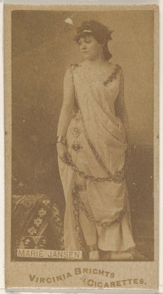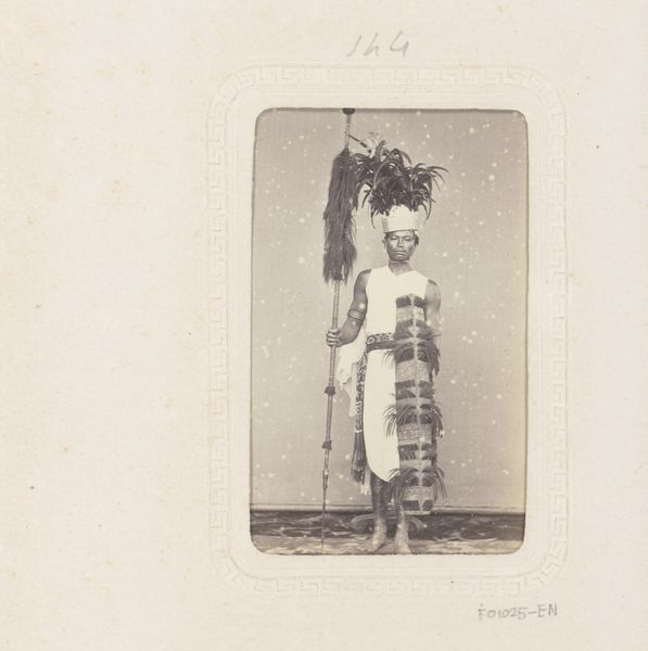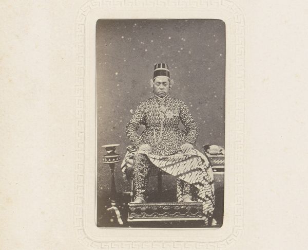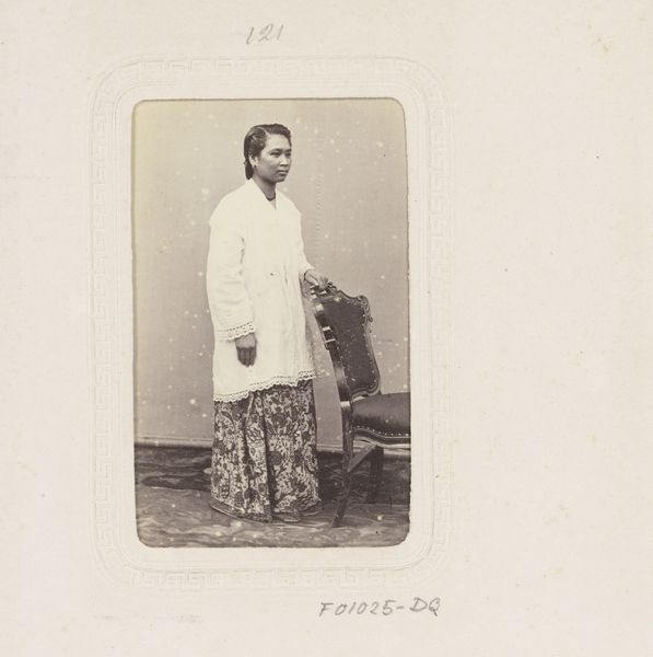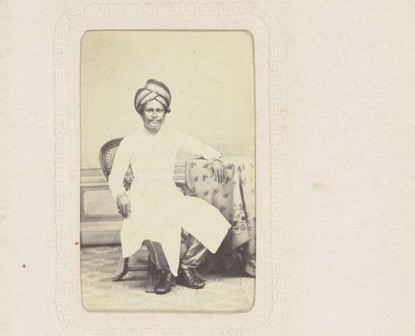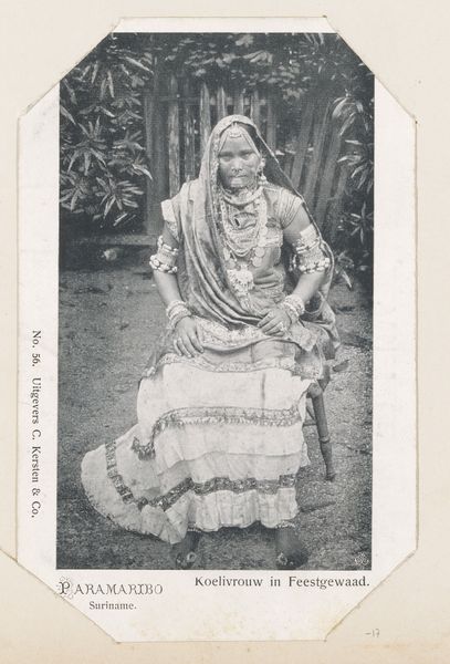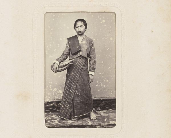 This is a small cabinet card photograph, taken by G.R. Lambert & Co., depicting an Indian woman. The composition is immediately striking; the woman is centrally positioned, her figure neatly framed by a table bearing flowers to her left and a neutral backdrop. The subdued sepia tones create a visual harmony, drawing attention to the textures of her sari, adorned with a checkered pattern that adds depth and movement. The woman's gaze is direct, establishing a sense of connection with the viewer, while her jewelry provides subtle accents of light. The photograph's formal elements—the lines of the table, the curves of the floral arrangement, and the delicate details of her attire—work together to present a carefully constructed image. This speaks to the conventions of portraiture at the time, reflecting both a desire for documentation and an engagement with broader aesthetic principles. The photograph invites us to consider not just the subject, but also the cultural codes and artistic intentions embedded within its composition.