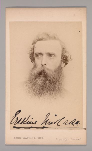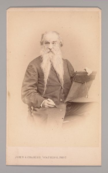 Curator: What a pensive portrait! There’s a softness to it that invites contemplation. Editor: Indeed. This gelatin-silver print captures the likeness of George Frederick Watts, a renowned painter and sculptor of the Victorian era. This photographic print comes to us courtesy of John and Charles Watkins, taken in the 1860s. The way Watts gazes just beyond the viewer hints at an introspective depth. Curator: I am immediately struck by the tonal range; those nuanced gradients that sculpt his face and beard, for instance. Observe how the hat is deeply shadowed versus the delicate gradations in his neck area, producing a dramatic contrast. The sharp focal plane focused on the subject's eyes lends the image depth. Editor: Note Watts' full beard; that signals his commitment to art as an unconventional calling, right? I would also say the soft focus and sepia tone contribute to an idealized vision of the artist. Photography here creates a deliberate link to traditional painting. It almost grants Watts, in hindsight, a saintly status. Curator: I’d say you make a persuasive argument for photographic art being used almost to sanctify his role, perhaps even preemptively enshrining him within the canon. It suggests his artistic contributions as timeless and of significance to be interpreted for generations. The sepia wash further adds that classic, aged impression as well. Editor: Considering it, the effect produced is incredibly fascinating. The photograph creates an iconic representation but maintains an ethereal quality due to those precise technical qualities you mentioned: soft focus, careful arrangement of dark versus light... Curator: It’s a dialogue between materiality and aura, a tangible object attempting to capture something beyond the physical realm. Editor: Absolutely, a perfect encapsulation of an artist grappling with identity and legacy in the burgeoning age of photography. Curator: It does offer us some new layers of perception even today.