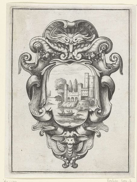 Editor: So this etching, "Cartouche met nautische attributen" from 1632 by Daniel Rabel, frames a coastal scene within this elaborate ornamental border, full of marine imagery. It feels very... contained, yet also evokes a sense of exploration. What strikes you when you look at this piece? Curator: The cartouche itself speaks volumes about the era's complex relationship with maritime power. We see classical symbols – dolphins, seashells – intertwined with tools of navigation, like the compass, framing the landscape of a harbor. It's essentially packaging the sea as a commodity, controlled and understood by those with the right instruments and knowledge. Editor: I see what you mean. Like, it’s not just celebrating the sea, but claiming dominion over it? Curator: Precisely. Consider who would commission such a work. This isn’t just decorative; it’s a statement about power, trade, and perhaps even colonial ambition. Who gets to map the world? Who benefits from maritime trade? It prompts questions about the human cost often erased from such seemingly celebratory imagery. How does seeing it that way shift your initial impression? Editor: It definitely makes it feel less romantic and more...political, maybe? The containment you mentioned becomes less about decoration and more about control, both artistically and politically. Curator: Exactly. The beauty serves to naturalize this claim of dominance. By understanding this context, we move beyond simply appreciating the artistic skill and engage with the ideologies it promotes. Editor: This really opened my eyes. I had never thought that something seemingly innocent could harbor complex political implications. Curator: Art is never neutral. It always reflects and shapes our understanding of the world, and power. Learning to see these nuances is crucial.