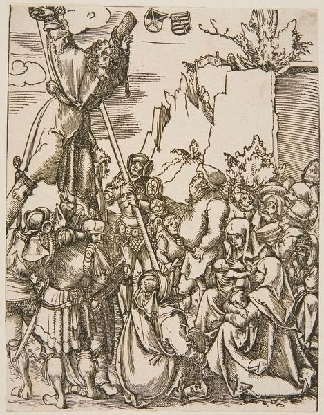 Curator: This intriguing print is entitled, Multiplication of Loaves and Fishes. Its creator is unknown. Editor: It feels like a dream—a stark, simple dream rendered in high contrast. Curator: The starkness comes from the black and white woodcut technique. It is the story of divine generosity. Editor: It’s striking how the crowd seems both uniform and individualized, a sea of faces but each one distinct. I'm drawn to the child at the center holding the baskets. They look like an innocent witness. Curator: Yes, that figure adds a layer of humanity to the miracle. An interesting blend of the earthly and the divine. Editor: It makes you wonder about belief and wonder. Food for thought, indeed.