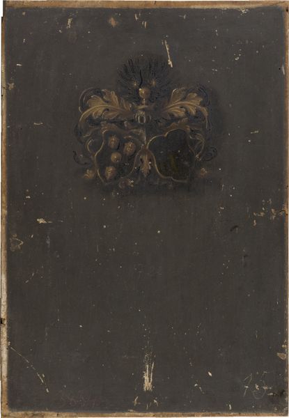 This small panel, 'Backside with Coats of Arms', resides here at the Städel Museum and was made by an anonymous artist. The artwork's dark ground immediately establishes a somber tone, contrasting sharply with the heraldic shields emblazoned upon it. These shields, featuring a horse on one side and a set of three points on the other, are rendered with a graphic simplicity that belies their symbolic weight. The composition, while straightforward, reveals a duality that demands attention. The shields, positioned almost as opposing forces, create a visual tension, challenging us to decode their relationship. Consider the artwork's surface: the texture and visible craquelure speak to time's passage, adding a layer of complexity to the reading of the shields. Does this erosion of the material support mirror the decay of the values these emblems once represented? The tension between the timeless heraldry and the tangible effects of age invites speculation on the mutability of meaning itself. Ultimately, the artwork's appeal lies in its capacity to provoke ongoing interrogation.