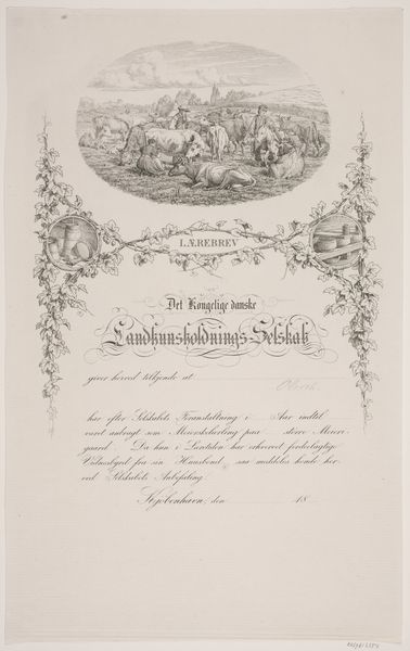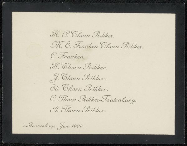 Curator: I find something undeniably poignant about this piece, an "Ondertrouwaankondiging aan Philip Zilcken," believed to be from 1890 to 1897, housed here at the Rijksmuseum. There’s such a restrained elegance to it. What is your first impression? Editor: I see a delicate balance between announcement and invitation, a formal script that hints at a deeply personal event. It speaks of societal expectations and private emotions intertwining. Curator: Absolutely. These pre-printed announcements, typically announcing marriage banns, reveal so much about the social fabric of the time. Note the artist – sadly anonymous – has designed this almost like a piece of fine art, reflecting the ideals of the Arts and Crafts movement. Editor: Considering the anonymous signature and given it announces a forthcoming marriage, I see this artwork as pointing to how even our most intimate experiences become tied to economic, gender, and class structures. Notice how Anton is labeled “Kunstschilder,” yet Anna's identity is limited to her last name. Curator: A potent observation. The explicit detailing of Anton Koster's profession establishes his social standing and economic capacity in a way that excludes Anna Unterhorst, underscoring disparities reinforced by patriarchal institutions. Further consider the date itself, the close of the 19th century; it's a time when societal expectations and artistic experimentation were undergoing considerable shifts. Editor: The stark announcement of "Geen receptie" - "No reception" – also raises questions. What implications did this absence of a public celebration carry for the couple's standing or for societal approval? Curator: Fascinating questions to pose to visitors. It provokes inquiry into the couple’s relationship to broader community and social expectations. In looking at the graphic elements and reflecting upon them, this image transcends a mere historical artifact, becoming a portal into understanding complex social dynamics. Editor: Yes, moving beyond its visual qualities, the image asks: How does artistic production legitimize gendered or socioeconomic positions and how can we disrupt or reimagine these inherited norms through artistic exploration? I am very curious about who received this. Curator: It is something to ponder; in essence, this small print reflects substantial cultural narratives.