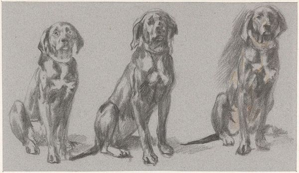 Curator: What a delightful, if somewhat formal, assembly of canines. I find myself smiling! Editor: Well, let’s dive in. What we have here is Carl Reichert’s “Four Dachshunds,” painted circa 1900 using oil paint. Immediately, I’m drawn to how the artist employs the medium; the slick, almost enamel-like surface gives these pups a very particular kind of finish. Curator: Indeed! Oil allows for such precise rendering. One thinks about the commission behind such a piece; were these pets of particular import to someone? Animal portraiture was hardly new, but the context of representing bourgeois status through beloved pets feels relevant here. Consider the leashes and medals. What do they tell us about their social standing? Editor: Precisely! And it’s hard to ignore how Reichert seems to celebrate materiality itself, the sheen of the dogs’ coats meticulously recreated with the application of paint. The oil, likely commercially produced and relatively standardized, contributes to an almost factory-like aesthetic, in its perfection, despite the handcraft. Curator: And shouldn’t we also be considering the historical positioning of this painting? Dog breeding, especially purebreds like these dachshunds, was rapidly changing at the turn of the century with dog shows, clubs, and changing conceptions of domestic spaces and animal rights. One could easily imagine these pampered pooches winning prizes. Editor: Of course, and I’m not just talking about awards—the actual minerals and pigments. Let's consider the provenance of these raw materials used to fabricate this canvas. These substances travel extensively before Reichert handles them! The creation of these paints is itself worthy of attention. The entire system from acquiring to refining—each part played its role. Curator: I am curious about what the painting lacked… I suppose in its time there would be few institutional art boundaries broken… While “dog portraits” are prevalent today and found frequently in galleries, the history is not long when this genre and these types of artmaking were accepted widely. Editor: I'd agree. Perhaps the interesting takeaway is looking at a hyper-real rendering and being so aware of everything THAT has led to it. Not so far removed, perhaps, from digital creations today. Curator: It certainly makes you consider where the lines are drawn and who draws them. Editor: Exactly. An artwork of its time—reflecting not only aesthetics but global economies, which affect everything.