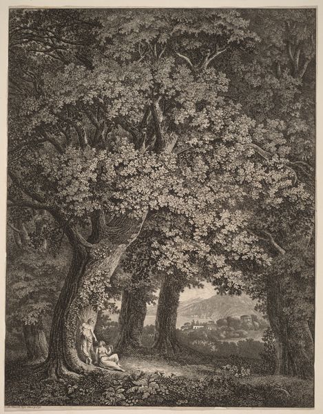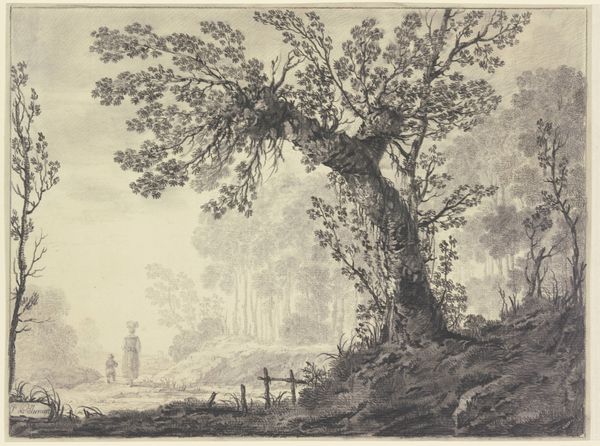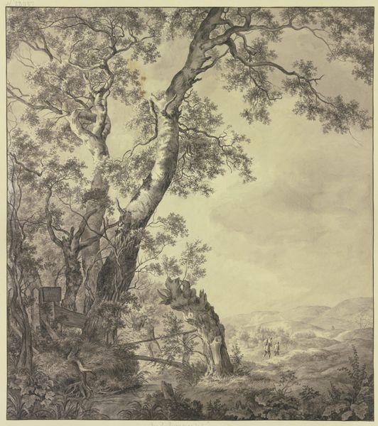 Editor: We're looking at Johann Wilhelm Schirmer's "Oak Trees in the Forest," created using ink, graphite, and charcoal. The textures, created using mainly muted blacks and grays, are making me think about nature's quieter, more reflective moods... What stands out to you as you look at this? Curator: You know, it reminds me of walks in the woods as a kid, the scent of damp earth clinging to the air. Schirmer has captured this sense of brooding quiet perfectly. Look how he uses light, or rather the *suggestion* of light, filtering through the dense canopy. There's a tangible weightiness to those aged trees; they've witnessed a lot. Does it strike you as melancholic? Editor: Melancholic, definitely, but there's a feeling of groundedness too. Maybe even a little awe? Curator: Awe is a fantastic word for it. These weren’t just botanical studies, you know. Romantic artists were obsessed with nature’s power, its ability to inspire something spiritual within us. Those tangled branches, almost clawing at the sky, it’s not just representation. It’s a metaphor, right? What could those aged reaching trees signify to you? Editor: I guess striving, enduring... reaching for something beyond? Curator: Exactly! And the softness of the charcoal juxtaposed with the sharp ink details—he's creating a dialogue between the real and the ideal, I think. It feels so alive despite its age. Editor: I agree. I initially just saw a forest, but now I'm considering all those layers of meaning! Curator: Art is so much better when you embrace its mysterious parts. Schirmer seems to know it, I’m happy you recognize its transformative magic, too!
