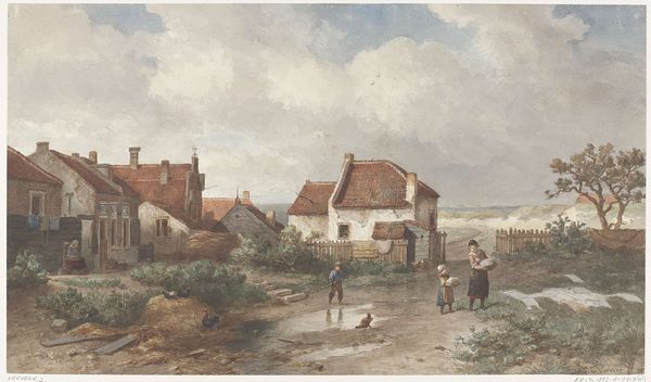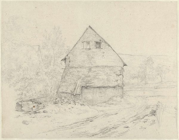 Editor: So, this watercolor and pencil drawing is called "Farmhouses," created sometime between 1825 and 1891 by Johannes Bosboom. It feels very quiet and still. I’m curious, what do you see when you look at this piece? Curator: I see more than just a peaceful landscape. Bosboom, while seemingly depicting a simple rural scene, is subtly engaging with complex societal shifts of his time. Think about the rapid urbanization happening in the Netherlands during the 19th century. Doesn't this image read as a deliberate, perhaps even political, choice to highlight a disappearing way of life? Editor: That's interesting! I hadn't thought of it that way. I was just seeing a quaint landscape. But if it’s realism, is Bosboom making a commentary on what is real versus what is lost? Curator: Precisely! The choice of watercolor, with its inherent fragility and translucence, almost emphasizes the fleeting nature of this rural existence. Consider also how the Golden Age heavily influenced the landscape genre. We are faced with questioning; who truly benefitted from that Golden Age, and who did not? Editor: It makes me wonder about the lives of the people who lived in these farmhouses. Curator: Exactly. Who were they? What were their stories? Bosboom gives us a glimpse, but it's our responsibility to consider their place within the larger social and economic narratives of the time. How were rural communities being affected? Editor: I suppose appreciating a landscape isn't just about admiring the view; it's about understanding the context of the people within it. I'm going to look at landscapes a bit differently from now on. Curator: Indeed! Seeing art this way encourages us to confront the complexities of the human experience reflected in every brushstroke. Hopefully that offers a much more holistic experience!