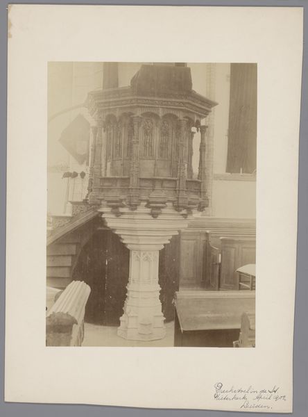 This photograph titled 'Vierschaar met de Rechtvaardigheid in het stadhuis van Nijmegen' was taken by Johannes Gerardus Kramer sometime between 1845 and 1903. It captures the ambiance of a courtroom or council chamber, a space laden with the weight of decisions, justice, and the silent stories of those who stood before it. The image presents a scene steeped in the historical and social frameworks of governance. The high-backed wooden chairs and the statue of Justitia towering above, embody the solemnity and power associated with legal proceedings. The photograph doesn't just show a room; it evokes the experience of being judged, of being part of a community governed by laws, and of the complex interplay between justice and power. During Kramer’s time, photography served not only as documentation but also as a reflection of societal values and ideals. What kind of justice was being served in this chamber? Who had access to it and who was excluded? This image invites us to reflect on the evolving notions of justice and the spaces in which they are enacted.