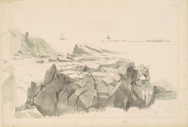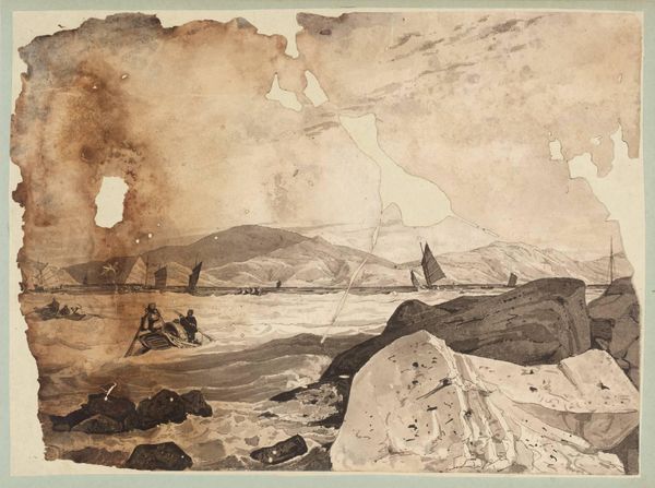 Curator: This wash drawing, made by George Chinnery in the early 19th century, depicts a coastal scene, likely in Macau or Southern China. I'm immediately struck by how the composition is built around these weighty, monumental rocks. Editor: The rocks definitely dominate the foreground, framing the ocean and distant shore. It feels…isolated, perhaps, though there are figures on the beach, hinting at colonial presence. Considering Chinnery lived and worked in India and China during the height of British imperialism, I wonder about the socio-political context. Curator: Absolutely. Chinnery was producing these works for a specific market, primarily British merchants and officials. The materiality of the drawing itself—the paper, the ink—speaks to trade routes and the availability of materials within that colonial network. Editor: And the subject matter! This isn’t just a neutral landscape. It's a portrayal of a space undergoing transformation through colonial influence. The figures on the beach...are they tourists, traders, or locals forced to labor? It raises questions about power dynamics and representation. Curator: It’s fascinating to consider the labor involved not just in the making of the drawing but in the scene itself. The extraction of resources, the movement of goods. Editor: Yes. This sketch is seemingly quiet, but it silently echoes with the complexities of a specific historical and political moment. Curator: Precisely. It pushes us to see the artistic process as intertwined with broader economic and social forces. Editor: It truly reminds us that art is never created in a vacuum.