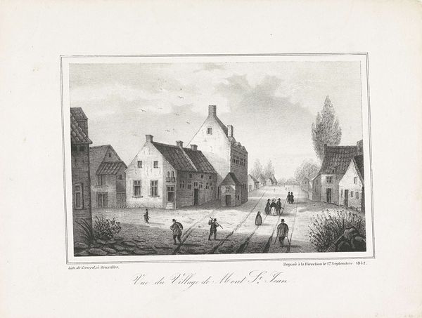 Curator: H. Gérard's "Hoeve in Mont-Saint-Jean," created in 1842, gives us a glimpse into 19th-century rural life through the medium of engraving. Editor: It possesses a somber charm. The limited tonal range evokes a sense of quiet, like a forgotten corner of the world captured in ink. There’s a strong sense of stillness and perhaps even the weight of time itself, like we are glimpsing the setting for a past historical tragedy. Curator: The engraving depicts a farmstead near Mont-Saint-Jean, close to Waterloo, a location laden with historical significance related to the Napoleonic wars. It is crucial to understand this piece within the context of post-Napoleonic Europe, a period of rebuilding and reassessment, and, as an image circulating in Belgium, very closely shaped by recent imperial experience. What narrative is presented by depicting this rural scene so close to a site of such pivotal warfare? Editor: Waterloo immediately shapes my interpretation. Consider the tower with the cross, presiding almost protectively over the complex. In a space marked by death and loss, its symbols, echoed in other forms and gables on the property, reflect both continuity and faith in the face of tremendous disruption. Curator: Exactly! Note also the figures populating the landscape: an affluent landowner with an equestrian escort approaching two more traditionally-dressed villagers near the main house, suggesting existing social hierarchies. These choices position the work within a very specific discourse of class and power in that period. Are they survivors returning to a changed world, claiming what remains of their homeland, or is it a depiction of Belgium itself being viewed from a critical perspective? Editor: These people have no faces: that can symbolize every person of every generation experiencing the ripple effect that tragedy sends throughout the landscape, rippling even throughout generations to come. It serves to link them to a larger narrative, to elevate beyond simply portraiture. The cobblestone street resembles the roads on the Stations of the Cross. Curator: I agree—it provides a point of entry to view not simply the image, but the culture in which it developed. This artwork, by portraying daily existence adjacent to the historic, emphasizes questions regarding cultural resilience, social equity, and the interpretation of historical events through material culture. Editor: Indeed. Looking again, I see an image pregnant with history, reflecting, reminding, and prompting reflection on events. Curator: A potent reminder that the past constantly informs and shapes our present. Editor: Art’s ability to echo those silent histories is indeed what gives it such power.