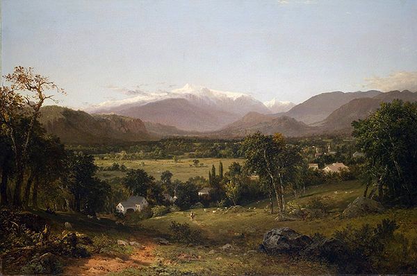 Curator: We're looking at "Mount Washington," painted in 1862 by Albert Bierstadt, a leading figure of the Hudson River School. Editor: It's quite grand, almost theatrical, in its composition. The way the mountain dominates the scene, with those hazy layers receding into the distance. It evokes a real sense of sublime awe. Curator: Indeed. Bierstadt and others from the Hudson River School believed in the spiritual and moral significance of the American landscape. The paintings reflected the belief that untamed nature was the manifestation of God and that westward expansion was the will of God. It reflected and justified Manifest Destiny, influencing governmental policies regarding Indigenous removal. Editor: I see that grand, sweeping perspective. It's masterfully constructed, the foreground with those dark, brooding trees contrasting with the ethereal light illuminating the peak. There's a distinct geometric quality too— the triangles of the mountain, repeated and echoed in the forms of the hills below, provide stability and balance. Curator: Precisely, while on the surface, Bierstadt's paintings reflect a peaceful American landscape, the realities and implications of colonial violence are missing from the frame. These paintings shaped a specific national identity rooted in land ownership and capitalist gain at the expense of the environment and its inhabitants. Editor: Interesting point. Focusing on form, look at the texture Bierstadt achieves with oil paint. The varied brushwork and use of plein-air techniques capture the essence of light. Curator: Bierstadt also made some careful decisions on the placement of figures, observe the presence of people on the lake; while small, they are there to signify that humans can and should interact with this space. This again plays into a justification for the displacement of Native peoples off this land. Editor: Your comments give us more insight into this piece; personally, the artist's treatment of light remains, to me, the most captivating element of "Mount Washington". The gradation from dark to light leads the viewer's eye directly up the mountain, and speaks to its beauty more broadly. Curator: By viewing these works from various angles, we can get a more comprehensive grasp of the artwork's cultural impact.