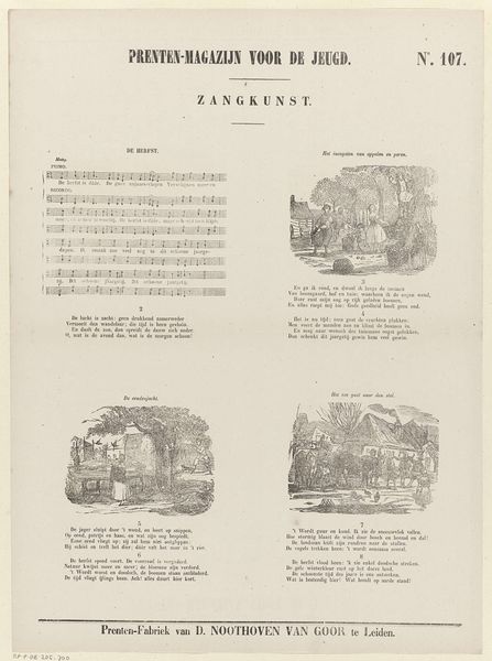 Editor: So, this is “Lente,” or “Spring,” a lithograph from sometime between 1850 and 1881 by Dirk Noothoven van Goor. It looks like it's from some kind of magazine? What catches my eye is how this piece is both visually appealing with its charming scenes but also… utilitarian? How would you interpret a work like this? Curator: Well, let's consider its original context. The title "Prenten-Magazijn voor de Jeugd" suggests this was intended for children, likely as part of an educational or recreational publication focusing on "Zangkunst," or the art of singing. These were not conceived in a vacuum; they emerge from very specific publishing ecosystems. Editor: I see, so the engravings depict springtime scenes, acting almost like illustrations for the song printed alongside? It feels a bit like a proto-music video. Curator: Exactly. It highlights the evolving relationship between visual and performing arts, and mass media. Remember that during this period, printmaking became increasingly accessible, broadening the distribution of art and ideas. Think about who could have access to those pieces: was that equally shared by all kinds of citizens, or were they exclusively intended for certain parts of society? Editor: That makes a lot of sense. Knowing that this was for children from a particular social class completely shifts my perspective. So, it’s more about the social history of art rather than just admiring it for its beauty? Curator: Both! The aesthetic choices reflect the social context, it represents more than mere pretty imagery, and by investigating its history we unveil some hidden forces in action. Editor: This has given me so much to think about concerning who art is for and the hidden messages it sends. Curator: Indeed. There is so much beyond the surface if we think critically about how the art came into being.