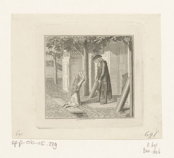 Curator: Here we have Karl Meunier's 1888 pencil drawing, "Non met breinaalden in de hand op het Begijnhof te Brugge," which translates to "Nun with Knitting Needles in Hand at the Beguinage in Bruges." Editor: It strikes me as both peaceful and subtly unsettling. The light is beautiful, almost dreamlike, but the almost ghostly figure gives me pause. What kind of paper did Meunier use? Curator: That soft, diffuse light certainly invites contemplation. Considering that the Beguinage at Bruges was a community for women who lived religiously but didn't take vows, the knitting needles likely signify both industriousness and humility. Editor: Humble materials and process, too. Pencil drawings weren't exactly prized in the late 19th century like painting. It speaks volumes that Meunier chose such a modest method for depicting a place dedicated to unassuming lives. What paper? Is it handmade, or industrially produced? Curator: The precise paper stock would need closer analysis, but consider how negative space plays a role. It almost feels as if the scene emerges from a spiritual ether. Bruges itself carries such potent symbolic weight – its canals, its history. Editor: But there’s a tension in using pencil, a sketching medium. Was this meant to be a study, something preparatory? Or is this the finished artwork? That would change my understanding of the labor invested, the intended audience, and the artist's view of craft itself. The subtle soft colors reinforce my ideas around "humble materiality" here. Curator: Interesting observation. Its unfinished quality almost reinforces the idea of a life in progress, a journey of faith. The nun could even represent a state of continual becoming, which adds a layer of symbolism. Editor: I'm still caught up by this focus on ordinary objects: the needles and yarn against this almost sacred backdrop. The repetitive action of knitting underscores labor, production, perhaps challenging conventional class distinctions within art itself. I would also consider more about the place: why the Begijnhof? Curator: That's exactly what intrigues me. Meunier juxtaposes the everyday, represented by her labor, with a sacred space. It seems like he's suggesting spirituality is not detached from everyday work. I find this composition speaks to the sacredness found within ordinary activities. Editor: I agree. Thinking about materials makes me aware of the wider social context too; the means and sites of artistic and manual production that would have existed in Bruges during this period and what that means in this particular picture. Curator: Indeed, analyzing this artwork unveils a conversation on symbolism and a reflection on the convergence of the ordinary and divine within the everyday practices of those women at the Beguinage in Bruges. Editor: It pushes you to consider, how much value do we put in the process versus in the finished, framed piece? In this case, those pencil lines suggest this is up for debate.