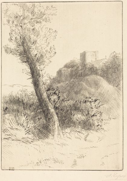 Editor: This is "Wash-house, called 'The Washerwomen'," an etching by Alphonse Legros. The scene feels quite still and contemplative; the landscape almost dwarfs the figures by the water. What symbols or stories do you think are woven into this seemingly simple image? Curator: It evokes the cyclical nature of life. Water, the sustainer, is also a site of labor. Consider the postures of the women. Hunched, bowed…are they only washing clothes? What burdens do they carry, both literal and metaphorical? What emotions are embedded? Editor: That's an interesting point, almost suggesting a melancholic mood alongside the everyday task. Does the architecture, the houses in the back, play any part in the story? Curator: Notice the bridge and the tower. Bridges always signify transitions, the passage between states, be it physical or psychological. And the tower, traditionally a place of either refuge or imprisonment...Does that connect with these women, or society itself, and where these figures fit in society? Where they do *not* fit? Legros makes one consider this interplay. Editor: So it's not just about what they are doing, but also where they are positioned in the wider world? Curator: Exactly. These repeated acts connect us to past generations and hint towards the future. We all share basic elements, and that visualizes a collective experience that transcends time, culture, and creed. Does viewing it inspire you to ask questions regarding time and legacy? Editor: Absolutely. I now notice those deeper levels within something initially seen as simple! Thanks for enlightening me. Curator: Indeed! Art often hides its deeper meaning within apparent mundanity. The act of attentive viewing becomes key.