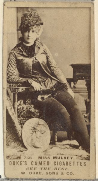 This is Card Number 391, Nellie Beaumont, from the Actors and Actresses series, created by W. Duke, Sons & Co. to promote Cameo Cigarettes. These cards reflect the late 19th century’s fascination with performers and the burgeoning culture of celebrity. Nellie Beaumont, an actress, is presented in costume, a deliberate construction of identity for public consumption. The card captures a moment in which gender, performance, and commerce intersect. These cards were designed to be collected, traded, and consumed, much like the cigarettes they advertised. Beaumont's image, reproduced and distributed widely, contributed to shaping ideas about femininity and entertainment. By placing actors and actresses on these cards, the manufacturer was able to associate their product with the glamour and allure of the theater. It's a reminder of how images, even in small formats, can shape cultural values and personal aspirations. These cards encouraged people to participate in a culture that was rapidly changing with the advent of mass media.