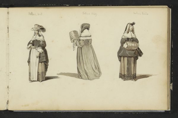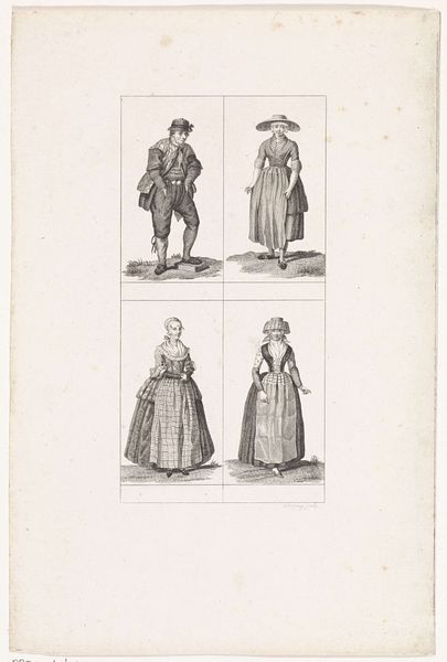 Curator: Here we have “Four Ladies' Costumes” by Daniel Nikolaus Chodowiecki, dating back to 1778 and held at the Rijksmuseum. The print, created with etching, offers a fascinating glimpse into 18th-century fashion. Editor: My initial reaction is one of almost suffocating opulence! The sheer size and intricate detailing of those gowns is quite striking. There’s an almost cage-like quality to some of the silhouettes. Curator: Exactly. Consider the sociopolitical implications inherent in these displays. Fashion, then as now, was a powerful tool for expressing status and identity. These weren’t just clothes, they were statements of power, crafted within a very rigid class structure. And gender, of course, is performative here—observe how bodies are presented for display and how clothing dictated the body. Editor: From a material perspective, I am fascinated by what it took to make these garments, think of the labour involved. The fabrics, the embroidery… These were luxury commodities. Also consider the constraints on the women who wore these designs, physically and socially, within those whalebone structures. Curator: Precisely. And, note the gaze; It implicates us in that culture. To look at it now, we also take a certain position and, in a way, accept that society's conventions of femininity, or refuse it, even by studying its artistic expression. Editor: Seeing the Rococo details translated through etching is intriguing, a print emphasizing the process involved to replicate or to disseminate these fashion symbols across boundaries. How many impressions were made? And what kind of craft or artisanship was required? We could probably discern information of workshops here. Curator: It certainly invites deeper reflection. Thinking about who had access to these images versus who actually wore the dresses... a fascinating tension arises regarding consumption and aspiration. The distribution of images in and of itself shaped social desire. Editor: Indeed. An image both capturing and constructing desire. And let's not forget the skill required by the artist to translate fabric into etched lines, thus capturing details through labour! Curator: I'm glad we’ve been able to tease out some of the historical complexities woven into these fashionable images. Editor: Me too, it reveals that art is always an intertwined web of both meaning and making.