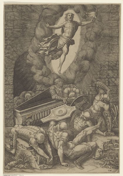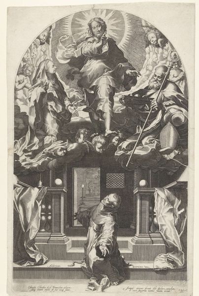Editor: This engraving, "Adoration of the Shepherds," made sometime between 1608 and 1650, depicts the Nativity scene. Pierre Brebiette's take on it feels quite crowded. There's so much going on in the upper register, but also this almost mundane element in the lower register. What do you make of it? Curator: You know, it reminds me of a theatrical production, wouldn't you say? A tightly packed stage, complete with heavenly hosts fluttering about! The contrast is part of the allure. See how the mundane and the divine share space in Brebiette's vision? It’s as if the artist asks, 'Where does our everyday end, and the sacred begin?' Are they not perhaps interwoven? Editor: So, you're suggesting the barn setting and humble animals below are just as crucial as the angels swirling above? Curator: Precisely. The ox and the ass aren’t mere props! Think of them as grounding us, anchoring the scene in reality, even as the heavens erupt in praise. Brebiette presents a down-to-earth miracle. Makes you wonder if perhaps true divinity lies not just in the spectacle, but in the ordinary, too. Editor: That's really thought-provoking. I initially saw it as cluttered, but you've highlighted a beautiful relationship between the mundane and the miraculous. I will definitely need to spend some time thinking about it. Curator: And who knows, perhaps that humble donkey in the cellar holds a secret all its own. Art, like life, offers new facets each time we return, doesn't it?