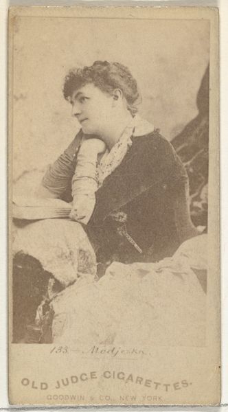 Editor: This collotype print, "Card Number 110, Modjeska," comes from the Actors and Actresses series issued by Duke Sons & Co. sometime in the 1880s. There’s a stillness and poise about it that's quite captivating. What can you tell me about the context around images like these? Curator: This piece offers a glimpse into the intersection of celebrity, commerce, and social identity in the late 19th century. Tobacco cards like this, featuring actresses, athletes, and other prominent figures, were incredibly popular. They weren’t just advertising; they circulated and solidified images of public figures. Editor: So, it’s more than just promotion for cigarettes; it's about shaping perceptions? Curator: Precisely! Duke Sons & Co. was shrewd in tapping into the public's fascination with stage personalities. Think about what it meant to collect these images. How did the wide distribution of this image shape perceptions of Helena Modjeska, the actress shown here? Editor: I suppose collecting the cards allowed ordinary people to feel connected to fame and talent. Was there anything subversive about popularizing the image of an actress, considering potential prejudices against them at the time? Curator: Yes, depicting an actress like Modjeska also played with societal perceptions. It put female figures into wider circulation, which had some potential to shift societal norms and expectations, by bringing actresses to a wider audience. Editor: This really changes my understanding; I had thought of it simply as promotional material! Now I see how it actively engaged with celebrity culture and gendered norms of the time. Curator: Exactly. By examining the historical context of an image, and how it was circulated, we understand not just the artistic intent but the broader implications for social history and identity. Editor: Thanks for opening my eyes to the bigger picture here. It shows me how even something seemingly simple like a cigarette card can tell us so much about the past!