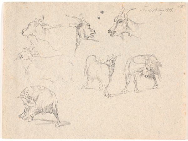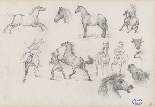Théodore Géricault made this drawing, "Sketches of a Horse," with graphite on paper, which is now held at the Art Institute of Chicago. The sheet presents a fascinating study in form and movement through its collection of horse sketches. The composition is informally arranged, giving us different perspectives and anatomical studies of horses, focusing particularly on the legs and heads. Géricault's choice to fragment and repeat the animal emphasizes an interest in deconstructing the form to understand its essence. The soft graphite lines create a sense of depth and volume, capturing the muscular structure beneath the skin. This approach mirrors a broader artistic and philosophical concern of the period—to break down established notions of representation and explore the underlying structure of the subject. His work isn't just about depicting a horse, it's about understanding how the interplay of lines and shapes can convey movement, anatomy, and even emotion. These sketches reveal a structural exploration, paving the way for future interpretations.