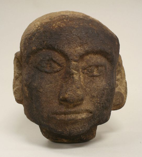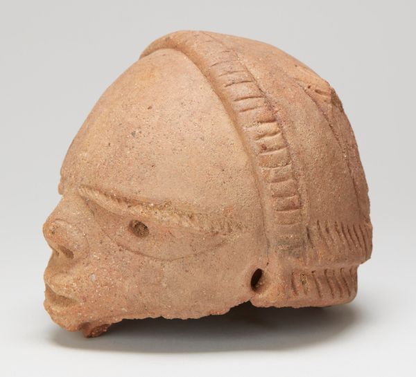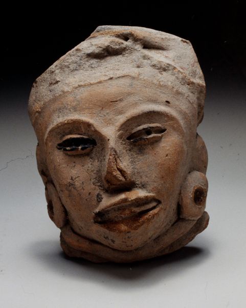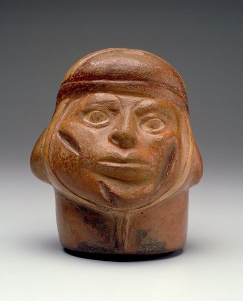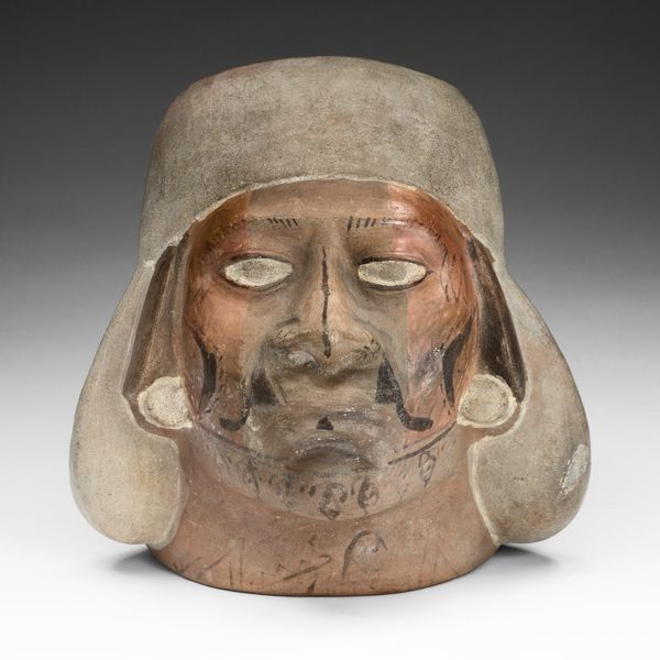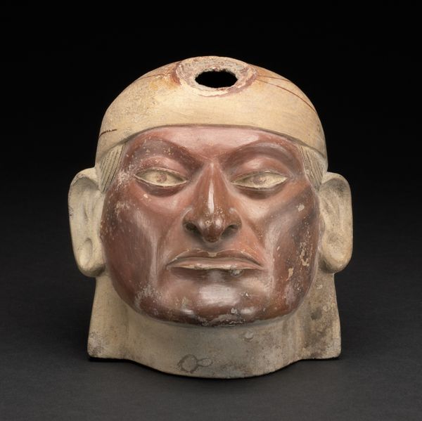 Curator: The piece before us, a ceramic marvel, goes by the title "Portrait Jar of a Ruler with Traces of Face Paint." It dates back to around 100 to 500 CE, and comes from the Moche culture. Editor: Wow. Just looking at it, there's a gravity to this object. A stern, quiet authority. The faint remnants of color only add to that sense of faded power. It feels like catching the gaze of someone from a long-forgotten dream. Curator: It is believed these portrait jars, made using molds and hand-finishing, functioned beyond mere decoration or even likeness. They likely played a role in ancestor veneration or even ritualistic practices, reflecting the social structure of the Moche people. The ceramic medium is especially significant given its wide access and skillful implementation. Editor: That's interesting, because there's this...accessibility to it, even now. Clay is so humble, so connected to the earth, and yet here it's elevating a human to something godlike. What was involved in actually _making_ something like this, technically? Curator: Moche pottery was produced at a large scale. Using methods that could mass produce the pieces speaks to a society able to establish standard ways of fabricating its cultural expressions through division of labor. Then you also get specialists whose time, and labor goes towards finishing it, adding that personal, unique character, suggesting this piece might have been more than "just another jar". Editor: It makes me think about how even "mass-produced" things can have individuality. And that ancient act of trying to freeze time by rendering a human face is somehow enhanced by using such an unassuming material. Curator: Indeed, a fascinating contrast. This single effigy embodies so much about the interplay between labor, belief and power that existed. Editor: Absolutely. And it resonates still, with a strange blend of regality and mortality. A humble jug made heroic. Curator: Precisely. Art as history and story bound together through matter. Editor: Well put. I think I’ll look at terracotta plant pots a little differently from now on!