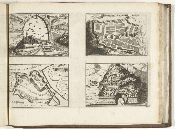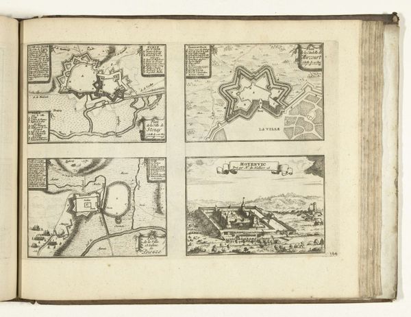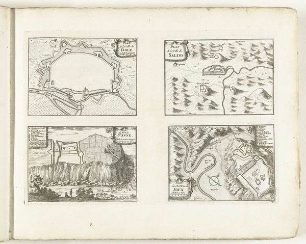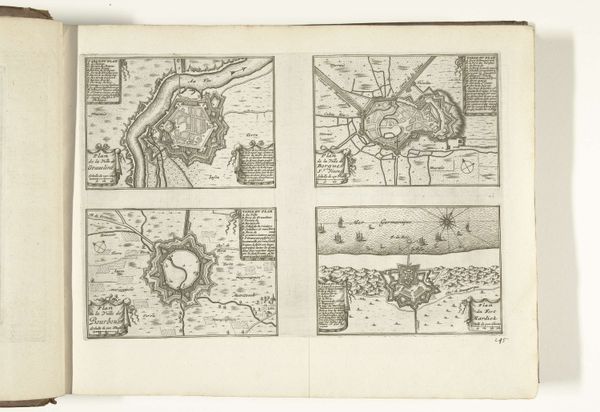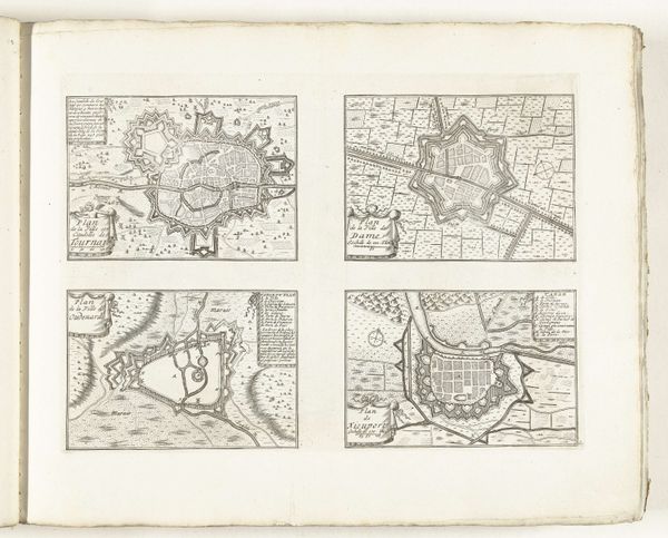 These plans of Verdun, Nancy, Clermont-Ferrand, and Marsal were made in 1726 by an anonymous artist using engraving. The composition is neatly arranged with each city plan occupying a quadrant, offering a comparative study in urban fortification. Notice how the lines delineate complex geometric shapes, particularly the star-shaped fortresses that dominate each layout. This emphasis on form transcends mere cartography; it speaks to the era’s obsession with rational design and military strategy. The artist’s choice to render each city with meticulous detail reflects a period deeply invested in order and control. Semiotically, these plans function as signs of power, where the design of each city serves as a symbol of its defenses and strategic importance. Consider the visual language at play, these formal structures not only represent physical spaces but also communicate the intellectual and political values of the time. This engraving invites us to consider how art can operate as a form of coded communication.