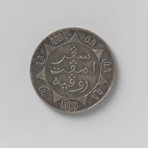Editor: So this is a silver coin from the Dutch East Indies, dated 1801. The inscription is beautiful, almost ornamental, yet it's also clearly functional, a form of currency. What strikes you most about this object? Curator: I'm immediately drawn to the complex history embedded in the materiality of this object. Silver, extracted under colonial labor, transformed into a tool of economic and political control stamped with unfamiliar iconography. How was this coin produced, what were the labor conditions? It speaks to flows of power and materials across continents. Editor: That's fascinating. I hadn't considered the colonial aspect in terms of material extraction. Do you think the unfamiliar iconography would have resonated differently depending on who was handling it? Curator: Absolutely. For the Dutch, it was a marker of colonial reach and economic dominance, a way to control markets. For the local Javanese, it may have represented a form of forced integration into a system that devalued their labor and resources. The visual language is appropriated, transformed for use by a foreign power. Editor: So the coin isn't just an object of trade, but also a statement of power and control rendered visible. What kind of labor do you think went into producing the die for the print on the coin, considering the detailed patterns? Curator: Intricate metalwork requiring skilled craftsmanship was likely involved, which, depending on who was producing the coins, reflects a kind of appropriation or collaboration. Perhaps Javanese artisans were contracted, willingly or otherwise. Investigating their role unveils another layer of this complicated colonial history. Editor: It’s interesting to think about how this tiny object encapsulates such huge economic and political issues. It certainly changes my perception of its value. Curator: Precisely. Its worth transcends monetary value; it becomes a symbol of the complex interactions between labor, materiality, and imperial ambition.