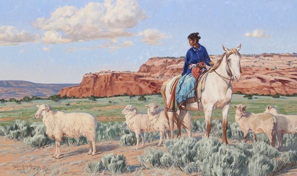 Editor: "Breathing the Same Air" by Logan Maxwell Hagege, looks like it’s oil on canvas, although it’s hard to be sure from the image. The overall mood feels tranquil, yet there's a subtle tension in the figures' gazes. The colors of the desert landscape and the figures create this compelling, almost dreamlike quality. What strikes you most about this piece? Curator: It whispers tales of timeless connection. Look at the geometry, that almost Art Deco flatness, kissed by the romantic light—it feels like a memory clinging to the present. Those clouds, puffed up with stories. Hagege captures not just a scene, but a shared moment in the vast theater of the Southwest. What do *you* feel when you look at their eyes? Editor: I think it is fascinating that each of the individuals depicted seems to have a different perspective and state of mind in the setting that they are placed in. How would you relate this piece to a sense of place and belonging? Curator: Precisely. It is in that space of knowing. Place anchors them, sure. But the blanket, the horse, the shared air—these create a belonging that transcends any map. It's blood, breath, and earth intertwined. They're not just *in* this land; they *are* this land, dreaming under that infinite sky. The subtle tilt of their heads tells you everything. Editor: So it is more than just a picture; it’s a story of interwoven destinies within a specific context? Curator: Exactly! The light of the west has painted this tableau in many hues before, but Hagege reminds us that timelessness is not static. We breath, and these painted narratives evolve, but with a core story ever the same. Thanks for drawing my attention to such beautiful art, even if it is but a pale comparison to reality. Editor: My pleasure! It definitely offered some insights into how art can evoke not just what we see, but what we feel connected to.