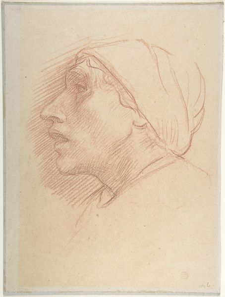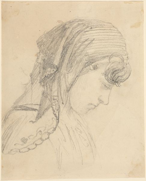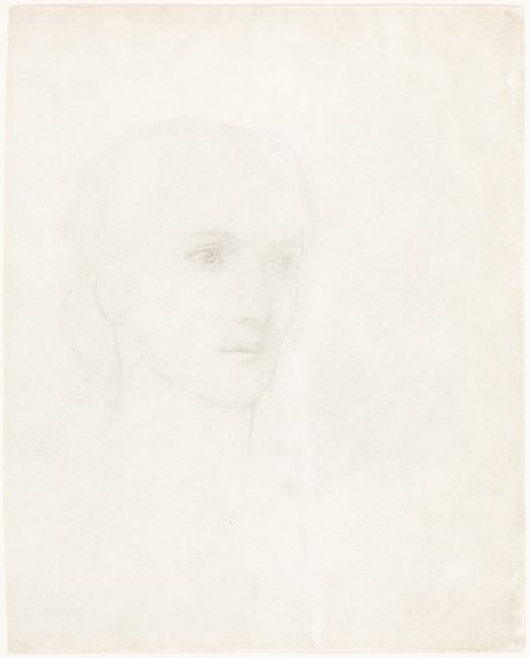 Curator: I'm immediately struck by the intimacy of this portrait. It's just a simple pencil sketch, yet there's such a quiet presence about her. Editor: Absolutely. We are looking at "Portret van een vrouw," or "Portrait of a Woman," created with pencil on paper. The work's creation is dated from 1834 to 1911 and is attributed to Jozef Israëls. It's currently held here at the Rijksmuseum. Curator: Israëls captures her so tenderly, almost ethereally, which, considering its time, connects to larger questions about female representation in art. Was he trying to portray inner life? What was it like for women of her class at the time this work was made? Editor: That ethereal quality could also be interpreted through the lens of its likely impressionistic leanings and the subtle use of light. It certainly encourages us to reflect on women's societal roles during that era and how artists participated in representing the nuances of female existence. I see echoes of how women were both idealized and, simultaneously, suppressed during this period. Curator: Exactly. And her gaze... there’s a contemplative quality, almost melancholic. I find myself wondering what she's thinking, dreaming about, and longing for. The lack of details encourages such reveries. Also, let's remember Israëls as a prominent figure within the Hague School, and that brings to mind specific conventions of depicting light, shadow, and mood associated with Dutch realism, so let’s also remember those conventions and that the work reflects those aesthetics as well. Editor: That gaze also pulls us into examining representation itself. How has art been complicit in objectifying the female form? By focusing on such a simple image, Israëls subtly disrupts those conventional, ideal portrayals, encouraging deeper empathy, wouldn’t you agree? Curator: In some respects, certainly. It also resonates on a much deeper level when considering art through the lens of a quiet reflection about life experiences, memory, and human emotions. Editor: Agreed, this invites a potent conversation about the portrayal of women. It asks that we examine these historical and cultural contexts which still affect how women are viewed today. It speaks to what this drawing—seemingly simple on its face—really manages to convey: power.
