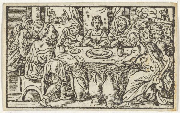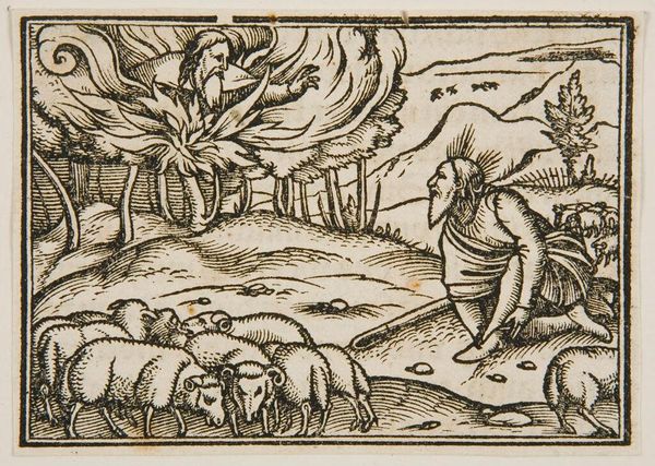 Editor: This anonymous woodcut, "Genesis 23: Sacrifice of Isaac," is striking! The stark black and white amplifies the drama. What symbols stand out to you in this depiction? Curator: Notice how the angel's intervention disrupts the expected narrative. What emotions are evoked by Abraham’s averted gaze and Isaac’s submission? The ram, a substitute, carries a heavy weight of cultural memory. Editor: So, it's not just a biblical story, but a representation of faith, obedience, and divine mercy, told through symbols? Curator: Precisely. The artist uses these visual shorthands to tap into deep-seated beliefs and anxieties about sacrifice. The image becomes a potent vessel for cultural understanding. Editor: I never thought about it that way; the symbols really do add layers of meaning to the story. Curator: Indeed, recognizing these motifs allows us to access a richer understanding of the artwork's purpose and impact.