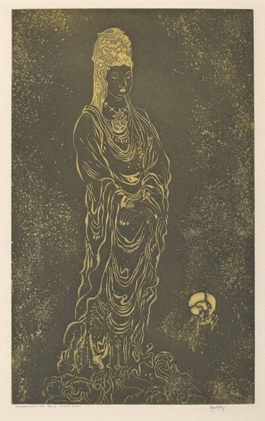 Curator: Leonard Baskin's "The Anatomist," now residing at the Tate, presents us with a compelling study of form and mortality. The image measures 502 by 279 millimeters. Editor: It gives me the shivers, this piece. The red against the black, the looming figure... it's like a dark dream. Curator: Indeed. The stark contrast highlights the artist's exploration of the human condition through its constituent parts: the skeleton and the figure, perhaps representing the mind or soul. Editor: The skeleton feels almost playful, perched there with its hand outstretched. Is it mockery, or a dance with death? Or maybe just a reflection of human fragility? Curator: The linear quality achieved through the woodcut technique further emphasizes the dichotomy between life and the structure that remains. Editor: Baskin's given us more questions than answers. It really makes you think about what it all means, doesn't it? Curator: A very astute observation. It serves as a potent reminder.