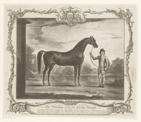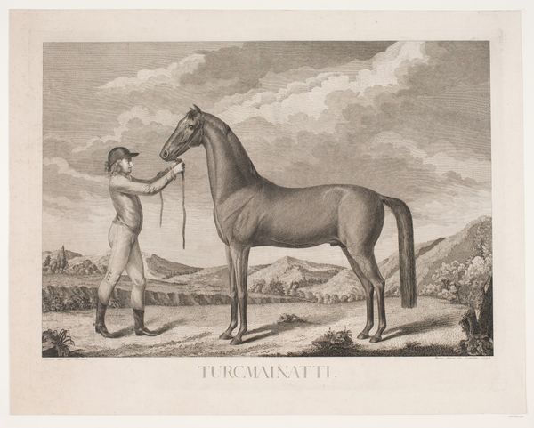 Curator: Here we have "Gimcrack" by George Stubbs, a print, dating to 1770. Editor: It feels quite formal, almost staged, with the horse taking center stage like a prized actor. Curator: Stubbs was famed for his anatomical precision. His paintings and prints often served to celebrate the British gentry and their prized animals. Editor: The horse is so meticulously rendered; it seems to almost leap off the page. But the human figure seems secondary, a prop. Curator: The horse portrait became a powerful symbol of status and wealth. Gimcrack himself was quite the celebrity in his day. Editor: It certainly captures a moment of pride and almost feels as if it is about to gallop away into legend. Curator: Indeed, and now, centuries later, we’re still admiring Gimcrack's celebrated form.