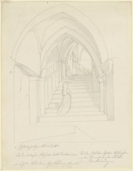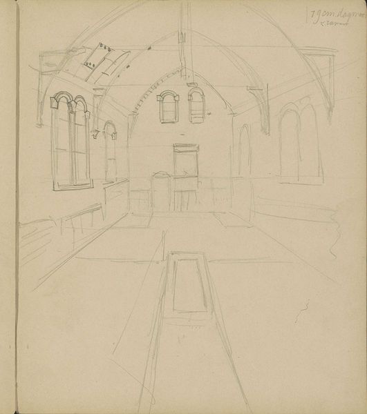 Curator: At the Städel Museum, we have before us "Sakristei zu Neckarsteinach" by Karl Ballenberger. It's a pencil drawing on paper, a study of a church interior. Editor: It's very faint, almost ghostly. The perspective draws you in, but it feels unfinished, like a memory fading at the edges. I'm immediately struck by how empty it is, a captured moment without human presence. Curator: Indeed, this work demonstrates Ballenberger’s interest in medieval architecture. The precise rendering of the Gothic window and vaulted ceiling points to a fascination with the craftsmanship and geometry inherent in these sacred spaces. We might also consider his labor and choice of dry media given architecture became closely related to industrial and nationalistic pursuits in the 19th century. Editor: Yes, the architecture dominates, but consider how the light plays within the structure. Notice the shadows defining the planes, lending volume to the flat surface of the paper. Also, the repetition of vertical lines and arched forms creates a compelling visual rhythm that guides the eye. Curator: From a materialist perspective, consider what the production of drawings like this meant in the 19th century. Artists became draftsmen. There was work to be done to document and claim Germany’s “glorious” past through art and architecture. Also, let's look at who consumes this art form—what does it mean for Germany? Editor: While your argument for the social context of this study is spot-on, I find the stark contrast of sharp architectural lines and soft pencil strokes creating a certain harmony here especially beautiful. Also the very limited value range creates a sense of quiet solemnity in the sacristy that could suggest various interpretations of religiosity and history. Curator: In thinking about the religious space captured by Ballenberger’s, one cannot help but think of the means through which these institutions obtained their wealth. Editor: Agreed. Thinking structurally gives an insight to the material impact art production has. I never truly saw this drawing beyond its forms, and you allowed it to mean so much more. Curator: And seeing it isolated from context made it a different, interesting experience for me. Thank you!