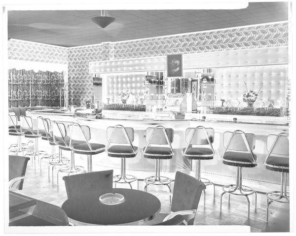 Curator: Here we have an untitled photograph by Hamblin Studio, showing a drugstore interior. Editor: It’s like stepping into a ghostly dream of a bygone era. The composition is all sharp angles and faded grandeur. Curator: The photographer employs a masterful use of mirroring, creating layers within layers. Observe how the photographer’s own reflection appears subtly in the mirror. Editor: Almost like they're haunting the space, a silent observer. I wonder what stories this place could tell. All those elixirs and remedies... Curator: Indeed. The tonal range, from the patterned wallpaper to the dark, solid counter, gives the image a compelling depth. Editor: It makes you feel a little melancholic, don’t you think? A beautiful, quiet sort of sadness. Curator: A fitting end to our visit, capturing the intersection of art, history, and personal reflection. Editor: Precisely. A frozen moment, eternally echoing.