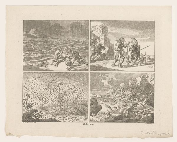 This print, made by Daniel Nikolaus Chodowiecki, uses etching - a process involving acid, metal, and skilled labor. Chodowiecki's image is sharply rendered. He made this by coating a metal plate with wax, scratching an image into the wax, and then dipping the plate in acid, which bites away the exposed lines. It is a relatively indirect process, allowing for fine detail. The print depicts scenes of labor and leisure, contrasting the singular and plural forms of Latin nouns. The way the image is made, through this somewhat painstaking printmaking process, is at odds with what's being shown. Etching was increasingly used in the 18th century for mass production, distributing images widely. Here, that very method throws into stark relief scenes of work – or the absence of it. This contrast between the detailed craft of printmaking and the varying states of labor depicted invites us to reflect on the social and economic structures that underpin both the artwork's creation and its subject matter. It reminds us that every image, like every object, is the product of specific materials, processes, and social contexts.