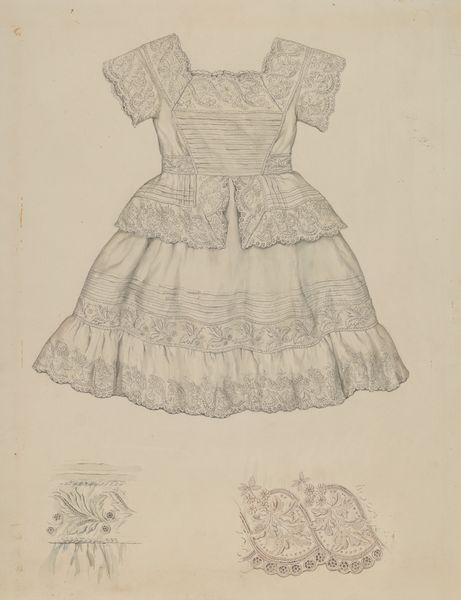 Curator: This lovely sketch is called "Child's Dress," dating from around 1937, rendered in pencil by Ray Price. It's quite delicate, isn't it? Editor: Yes, there's something both wistful and very precise about it. Almost like a ghost of childhood… all frills and formality, trapped in pencil lines. I wonder what occasion this dress was for. Curator: Considering the era, one can almost certainly associate the garment with a whole system of beliefs. In the 1930s, clothing for children – and especially girls – held strong symbolic weight tied to innocence, virtue, and the perpetuation of tradition. Did it have any other meaning to the wearer or viewer? Editor: Absolutely. This dress almost looks like something from a fairytale! The ruffled sleeves and the elaborate embroidery details suggest a costume, or something meant for an elaborate performance, for being “seen,” maybe during that time in history? Curator: Precisely. The ornamentation you mention evokes something beyond mere utility. The circular and floral designs embroidered at the hem and around the collar resonate with familiar emblems of fertility and natural harmony – ideals deeply woven into the social fabric then. Editor: Right. What’s interesting too is the presence of a second, smaller dress sketched beside it. Like a rough draft or a second thought, the dress stands next to itself as a different form. Did she want the smaller sketch as a study? Curator: Exactly! These additional design sketches provide glimpses into an artist's process, an early moment of their consideration, showing how ideas morph on paper. And with fashion design, one can observe so many influences beyond individual whimsy, from trends to traditional forms, all shaped by social expectations. Editor: A frozen, material representation. A silent voice. Still, despite the social trappings, the drawing feels very intimate. This soft, meticulous pencil work holds such grace. There’s also an ambiguity of an empty dress. Curator: Exactly. We have a concrete visual marker for considering ideas of cultural conditioning or perhaps even the complex dialogue between personhood and clothing over time, to be seen and studied again by today's audiences. Editor: This small, thoughtful image resonates beyond its surface. In its deliberate absence and its intricate depiction, there is, for me, a quiet provocation that is surprisingly human and vulnerable. A single point to remind the modern viewer how dress has developed over decades. Curator: Absolutely! Its subtle precision allows these simple lines to evoke powerful, resonating concepts for anyone open to interpreting beyond the first glance.