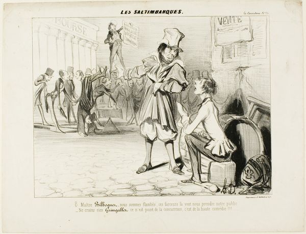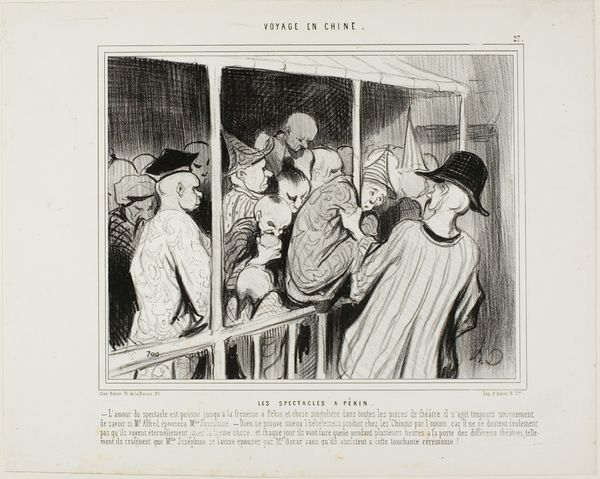 Curator: The Bathing-Cars by Honoré Daumier presents a rather stark scene. What strikes you about this print? Editor: Well, it appears to depict workers cleaning what looks like train compartments. The raw quality of the lithograph and the presence of laborers give it a documentary feel. What do you see in this piece? Curator: The piece highlights the materiality of travel and labor. Daumier uses the print to expose the often-uncomfortable conditions of mass transportation in 19th-century France, the labor behind maintaining even basic hygiene. It prompts us to consider who bears the brunt of progress. Editor: So, it's less about the romance of travel and more about the realities of the working class supporting it? Curator: Precisely. It encourages us to consider the socio-economic context of the burgeoning railway system and its effect on labor. Editor: I hadn't considered the labor aspect so directly before. Curator: Seeing art through the lens of production and the human cost, brings hidden narratives to light.