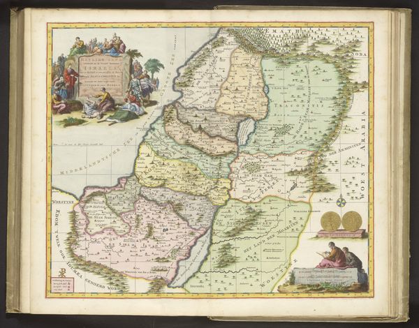 Curator: This is an etching with engraving on paper, titled "Kaart van Normandië met Guernsey en Jersey," essentially a map of Normandy with Guernsey and Jersey. It's anonymous, dating from somewhere between 1671 and 1706 and part of the Rijksmuseum's collection. Editor: My first impression? Utter precision, almost sterile, and a quiet assertion of dominion. The pastel color washes only amplify that initial detachment, don't you think? Curator: Absolutely. See how the engraver delineates space, marking out territory, possessions, property through hard lines? The baroque flair—the embellishments—try to hide the assertion of ownership, I wonder who commissioned this and what this map was made for? To possess land through representation… interesting concept. Editor: Well, it's definitely successful on that level! The topographical details read quite well. There's something about the cartographic lines, the dedication to geometric accuracy that provides some semblance of objective authority. The washes of pastel somehow lend a softening, persuasive influence that says come, and wander over my property, explore, invest and live. Curator: Good point about the objective authority thing—maps were serious business. The inclusion of those little vignettes, like the figures lounging near the title, that softens it too, making it more palatable than a simple grid, which is interesting as these kind of scenes became an almost essential element. Editor: Semiotics. I agree, the vignettes introduce narrative and identity into an otherwise abstract space. But, speaking to that grid... Look how the map utilizes sections and subsections within the divisions; like smaller properties sitting inside others. An almost fractal layering going on that mirrors our reality... Curator: Fractals of ownership. I love that, you are right it is echoing our material realities in fascinating and complex ways. This piece seems to capture a period when place was becoming space: when territory transforms into representation. A transformation from ownership to control… Very prescient! Editor: Agreed. Ultimately, it underscores how even seemingly objective forms, like maps, are imbued with power and perspectives. Something to keep in mind.