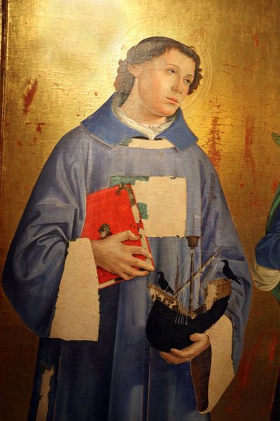Pietro Perugino painted this panel of Saint Placidus as part of a larger polyptych, likely in the late 15th or early 16th century. The work exemplifies the serene style favored in the Umbria region of Italy, but it also speaks to the significant role monastic orders held within the religious and social fabric of the time. Consider how the image creates meaning through visual codes. The subject is a young Benedictine monk, eyes raised to heaven, and holding a palm frond that signifies martyrdom. This would resonate deeply in a culture where religious institutions wielded immense power. It suggests a society grappling with faith, sacrifice, and the hope of salvation. The institutional history of the Benedictine order, with its emphasis on stability and communal life, provides further context for understanding the values embedded in this representation of monastic devotion. To truly understand a work like this, we must delve into historical archives, religious texts, and social histories. Only then can we grasp the full significance of this painted panel.